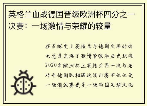 英格兰血战德国晋级欧洲杯四分之一决赛:一场激情与荣耀的较量